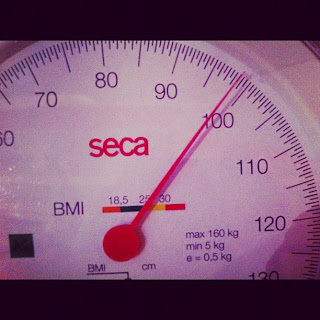 Man hade ju kanske trott att någon som börjar närma sig 100 kg har lite överloppshull här och där men brorsan blir bara i bättre och bättre form i takt med att vikten höjs. (Bilden på vågen snodde jag från hans facebook)